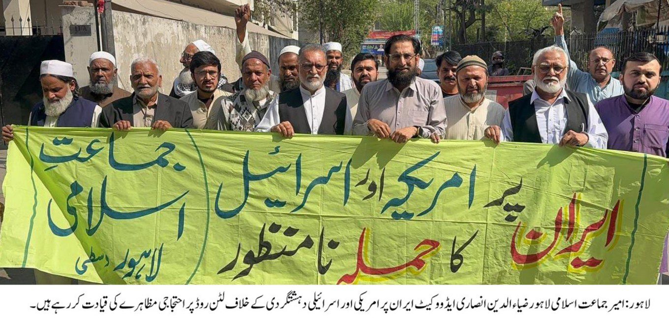لاہور۔ڈیلی ٹائمز۔ جماعت اسلامی وسطی لاہور کے زیر اہتمام لٹن روڈ، لاہور پر امریکہ اور اسرائیل کی جانب سے ایران پر حملے کے خلاف احتجاجی مظاہرہ کیا گیا۔ احتجاج کی قیادت امیر جماعت اسلامی لاہور ضیاء الدین انصاری ایڈووکیٹ نے کی۔مظاہرے میں ڈپٹی سیکرٹری جماعت اسلامی لاہور مزرا شعیب یعقوب، رہنما وسطی لاہور ملک منیر احمد سمیت کارکنان اور شہریوں کی بڑی تعداد نے شرکت کی۔